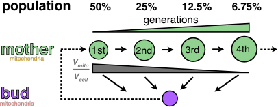 The daughter buds become newborn mothers, which comprise half of the population at any time, while mothers of increasing generational age comprise a decreasing proportion of the population. Together, this asymmetry in mother-bud mitochondrial behavior achieves the observed population-wide, stable, mitochondrial to cell size scaling relation.